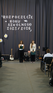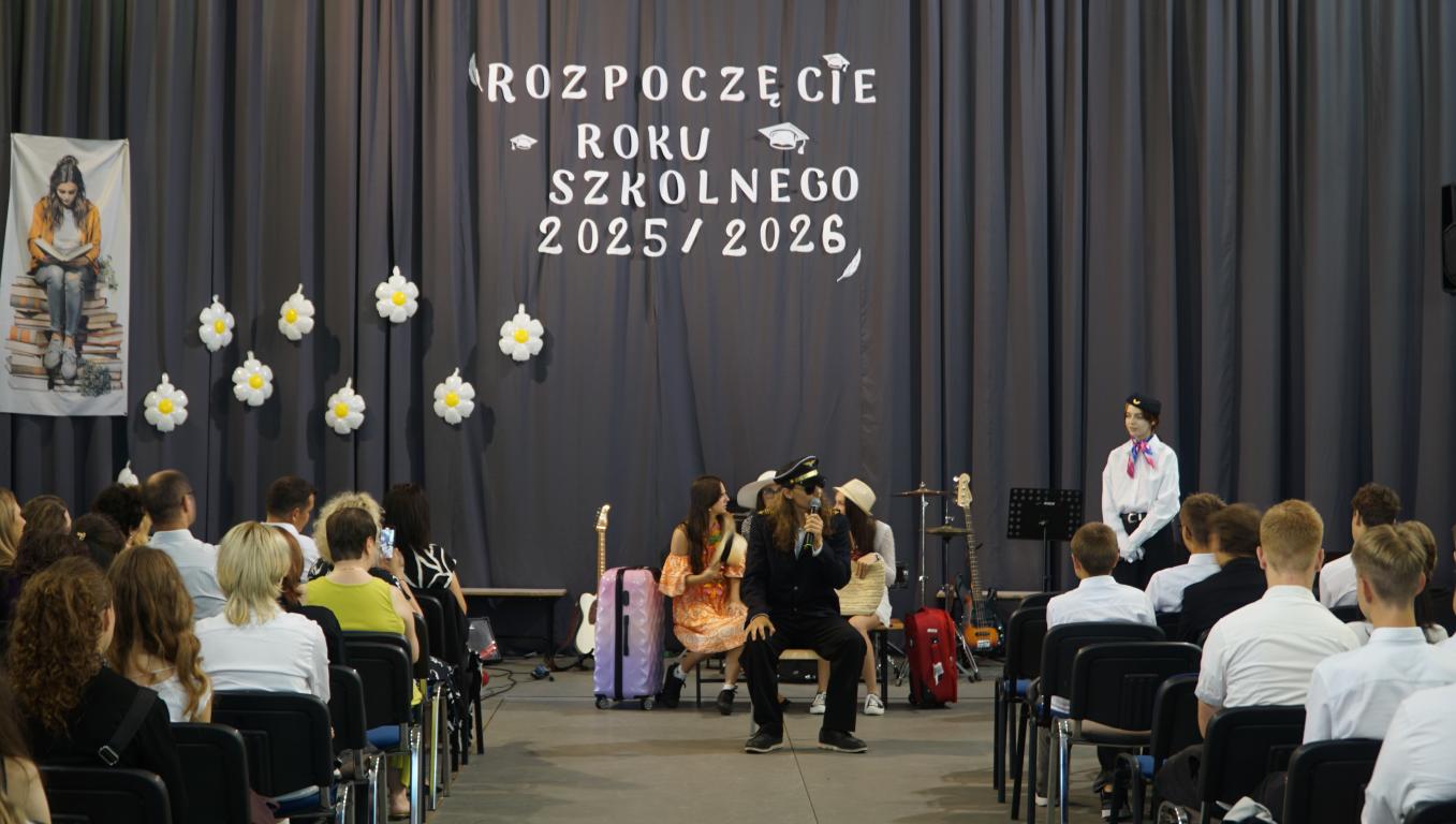 Klara Paszkiewicz i Martyna Przywara z klasy 2o/sj poprowadziły przedstawienie, w którym wystąpiły uczennice Lena Wróbel, Lena Banasiak, Natalia Kędzierska, Milena Brojacz i Nikola Michałowska również z 2o/sj. Uczennice wcieliły się w turystki wracające samolotem z wakacji. Po niesamowitych wakacjach, rozpoczęły swoją kolejną przygodę. Tym razem w murach naszej szkoły. W rolę pilota samolotu wcielił się Karol Kozyra z klasy 5 TG a w roli stewardessy wystąpiła Magda Pellar również z klasy 5TG. Cały występ uświetnił nasz zespół muzyczny w składzie: Emanuel Kecher, Magda Pellar, Karol Kozyra, Konrad Kraszewski (instrumenty) oraz Julia Dębinny, Miłosz Kurzok i Maria Bąba (wokale).